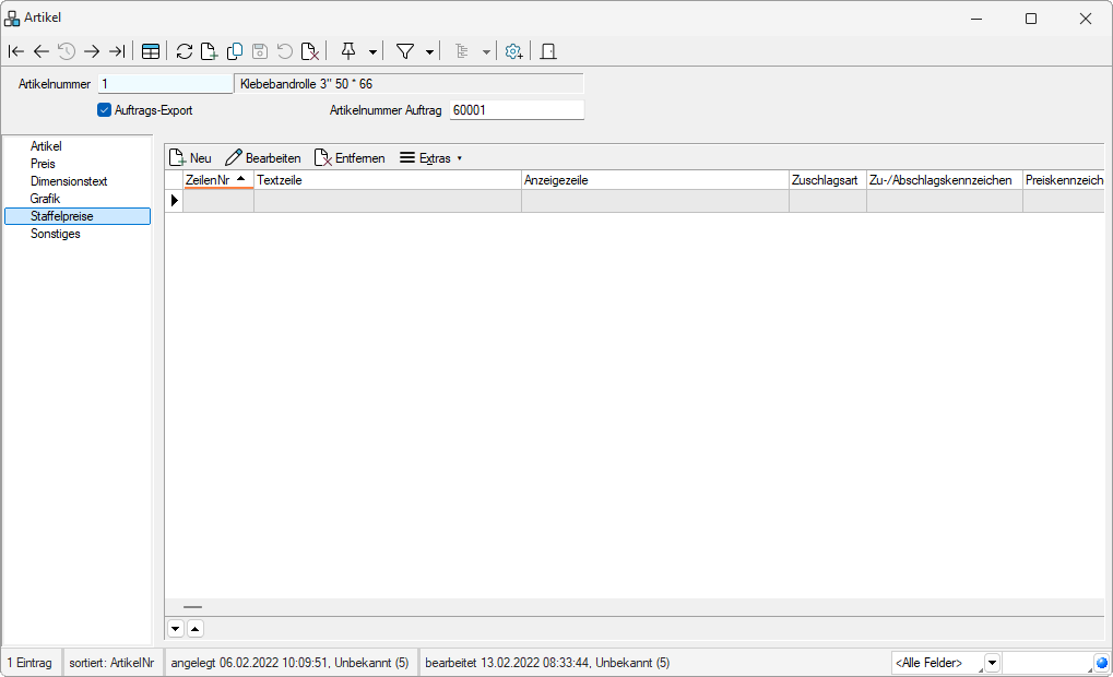 Unter Stammdaten / Allgemein / Artikel (Seite Staffelpreise) haben Sie die Möglichkeit Staffelpreise für den Artikel anzulegen, zu bearbeiten und zu löschen.