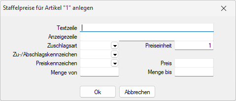 In Verbindung mit dem SelectLine Auftrag, wird der DATANORM-Satz "Z" mit dem Bearbeitungsmerker 1 zur Pflege von Staffelpreise unter Stammdaten / Allgemein / Artikel (Seite Staffelpreise) genutzt. Zu einer Artikelnummer können bis zu 99 Staffelpreis-Sätze, unterschieden durch die Zeilennummer, hinterlegt werden.