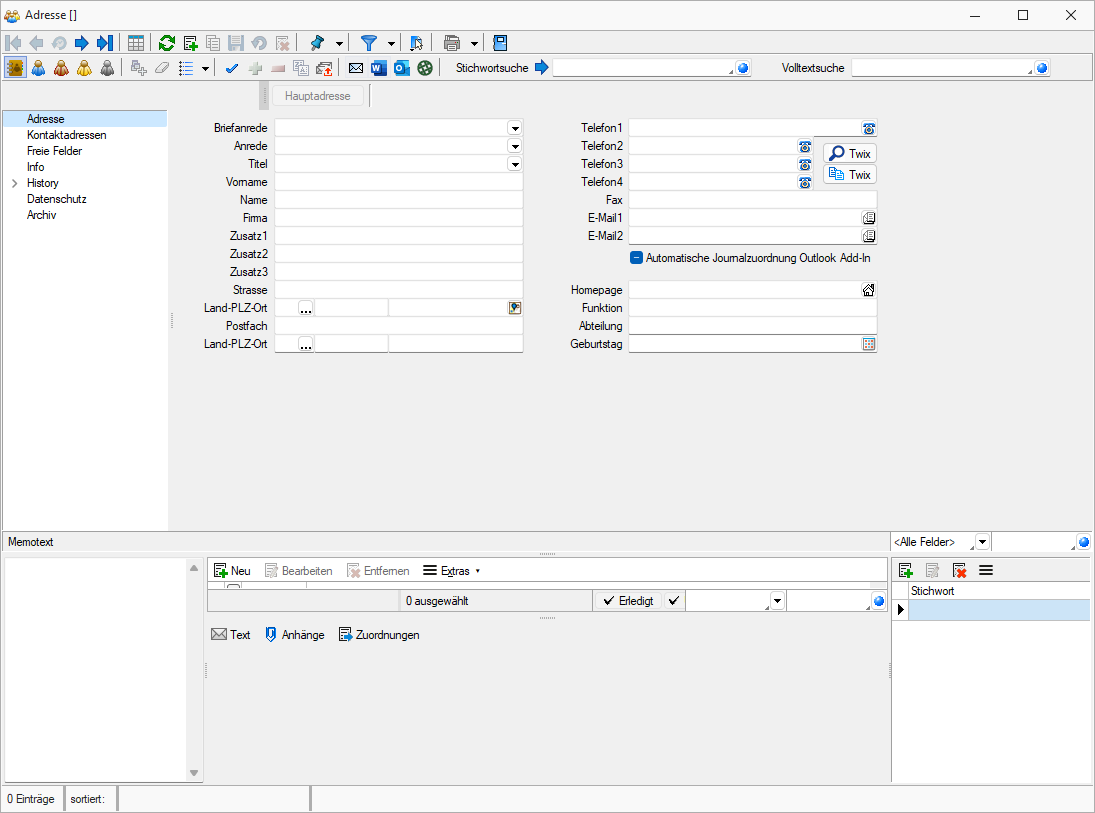 Bereich Stichworte - Über die vorhandenen Schalter können Sie der Adresse Stichworte zuordnen, die Sie für die Stichwortsuche auswählen können.