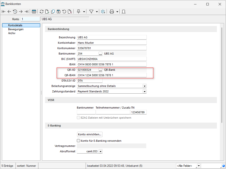 Diese Daten werden eingefügt unter Stammdaten / Konstanten / Bankkonten / Kontodetails.