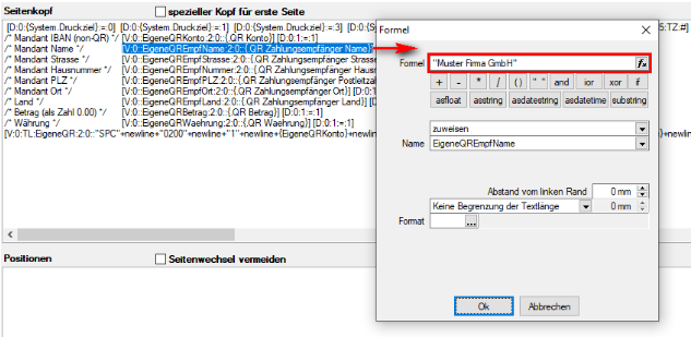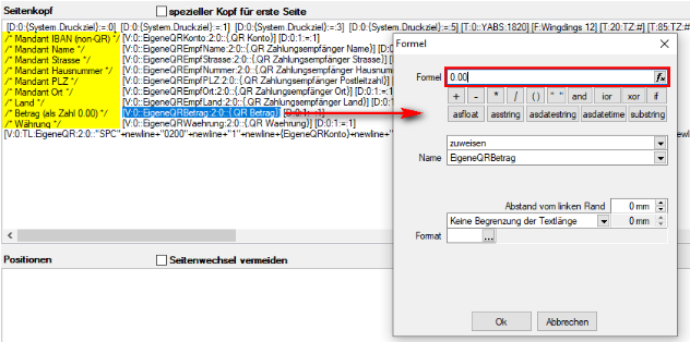 Der QR-Code der Druckvorlage ist als Formel vorbereitet um gewisse Informationen übersteuern zu können. Diese Informationen sind im Kopf der Druckvorlage (hier gelb markiert) ersichtlich. Wenn man beispielsweise eine QR-Rechnung mit Betrag «0.00 CHF» erzwingen möchte, muss man nur den Wert der dazugehörigen Formel anpassen. Auch weitere Felder können somit übersteuert und individuell befüllt werden.
