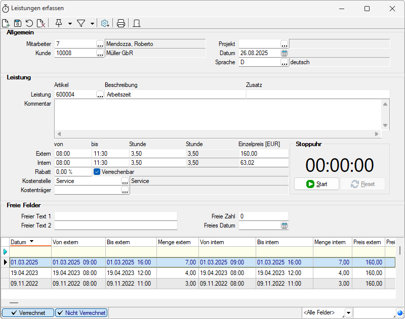 Der Unterschied zwischen externer und interner Leistung besteht darin, dass die externe Leistung über den Verrechnungsassistent berechnet wird, die interne dagegen für die Auswertung der Mitarbeiterauslastung verwendet wird. Unterschiedliche Eingaben können z.B. Sinn machen, wenn Sie dem Kunden immer volle Stunden berechnen, intern aber den genauen Zeitbedarf auswerten möchten.