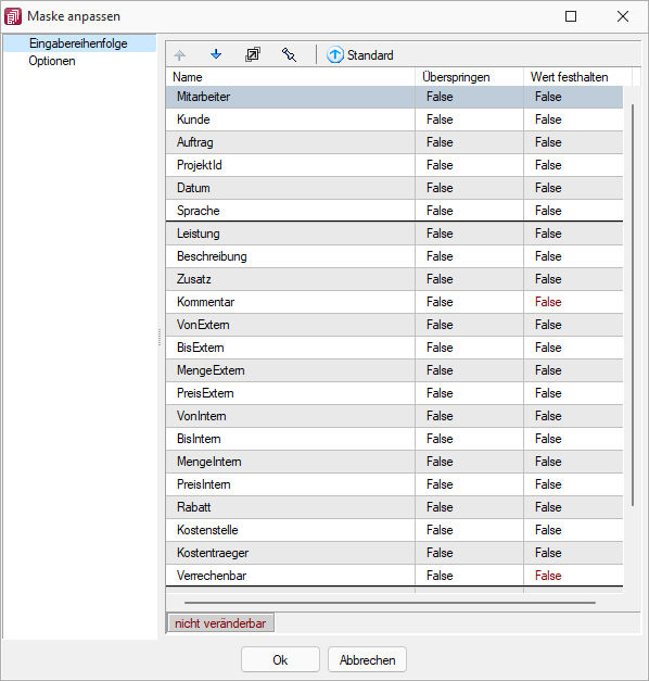 Ausserdem können Sie festgelegen, ob ein Feld beim Navigieren in der Maske übersprungen
