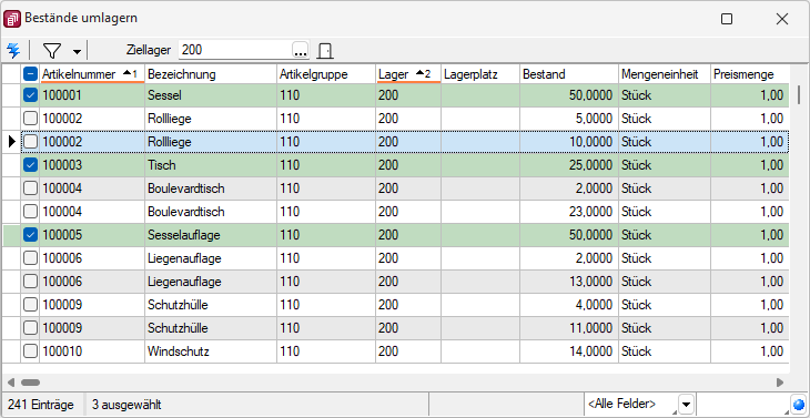 Sie können beliebig oft umlagern, das Ziellager wechseln und die Tabellenansicht durch Filterung neu einschränken.