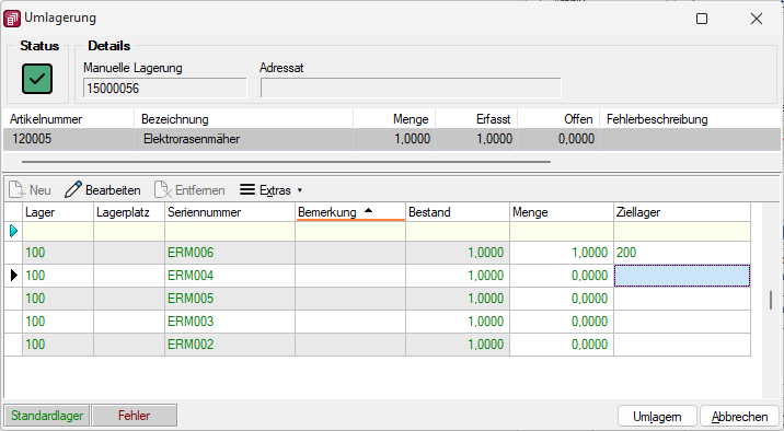 Hinweis: Wurde kein Quelllager angeben, wird das Ziellager für alle Positionen vorgetragen, sofern es nicht dem Lager der Bestandszeile entspricht.