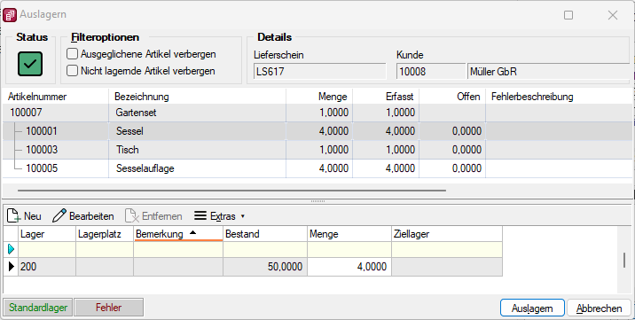Für Handelsstücklisten und bei Umlagerungen aus Belegen werden alle Positionen zu einem Lagerungsdialog zusammengefasst und in der Positionsanzeige aufgelistet. Um die Tabelle übersichtlicher zu gestalten, stehen Ihnen zwei Filteroptionen zur Verfügung, mit denen ausgeglichene (Offen=0) und/oder nicht-lagernde Positionen ausgeblendet werden können.
