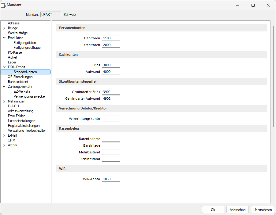 Um anhand der Belege Buchungssätze für die Fibu erstellen zu können, müssen unter Mandant / Einstellungen (Seite Fibuexport) die entsprechenden Konten hinterlegt sein.
