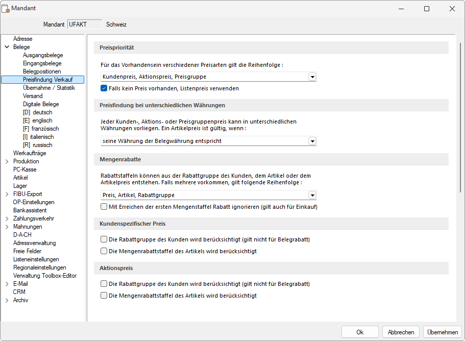 Unter Mandant / Einstellungen (Seite Belege / Preisfindung Verkauf) können Sie die Voreinstellungen für die Preisfindung bei der Belegerfassung vornehmen.