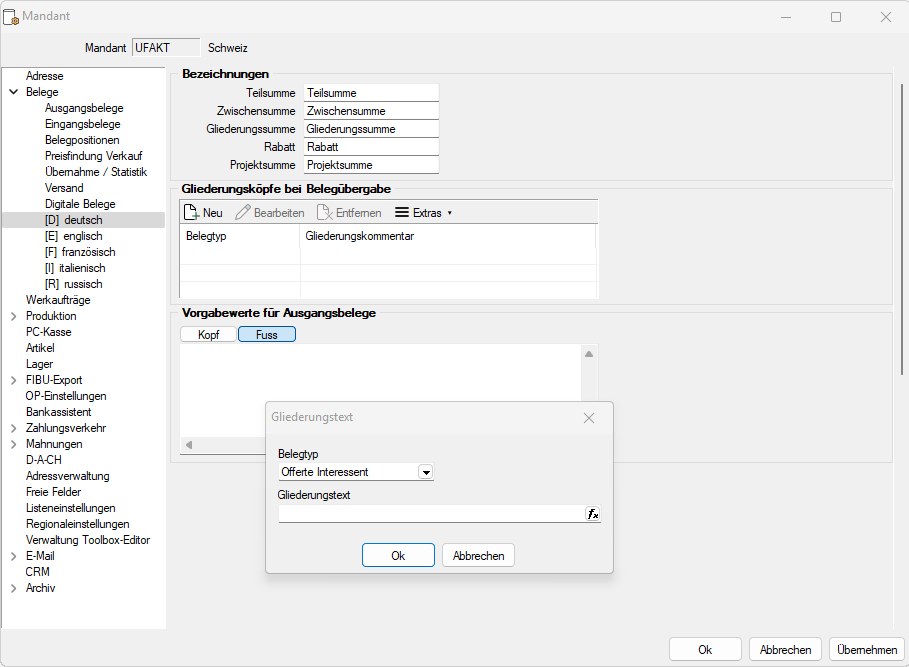 In der Maske Mandant / Einstellungen (Seite Belege / Sprachen) haben Sie die Möglichkeit, den Gliederungstext in beliebiger Sprache für jeden Belegtyp (Quellbeleg) frei zu definieren. Die Sprache muss im Programm angelegt sein.