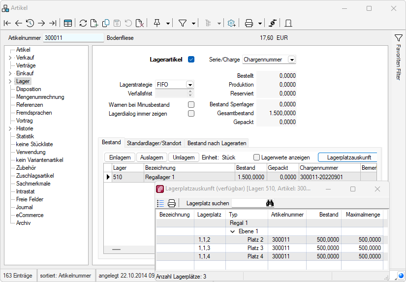 Auf dieser Seite werden, wenn die Option Lagerartikel gesetzt ist, alle lagerbezogenen Angaben für den Lagerartikel verwaltet und angezeigt: