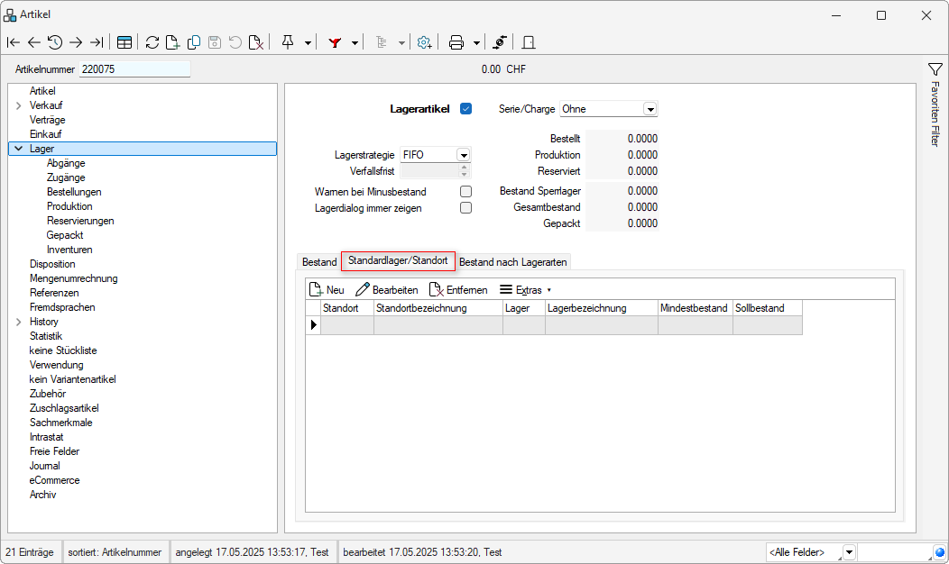Wenn zum Artikel mehrere Standort / Standardlager-Kombinationen angelegt sind und Sie nicht über das Standortmodul separat für jeden Standort bestellen, werden beim Bestellvorschlag Mindest- und Sollbestand zu allen Lagern summiert.