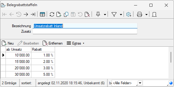 Allgemeingültige Belegrabattstaffeln für den Verkauf können Sie in den Mandanteneinstellungen erfassen.